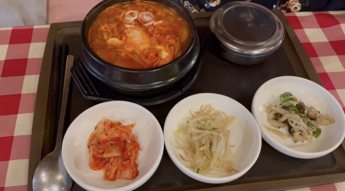 ランチは純豆腐チゲ。見た目と違って辛くない。大好きな豆腐がたっぷり食べられて幸せ。スープもとても美味しい。カラダが温まって幸せな気分になりました。
